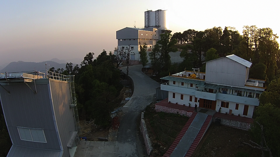 Aerial view of the Devasthal Observatory. The ILMT enclosure is located at bottom left of the image. To the right is the dome of the 1.3m DFOT and at the top right the dome of the 3.6m DOT.